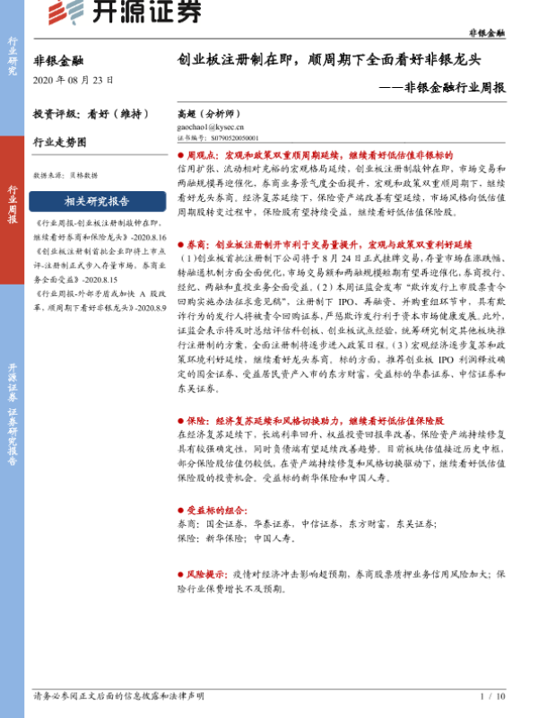 【开源证券】【20200823】非银金融行业周报:创业板注册制在即,顺周期下全面看好非银龙头-10页 行业研究