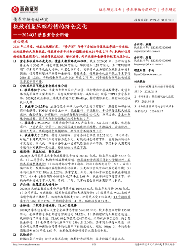 【浙商证券】【20240819】2024Q2债基重仓全图谱:极致利差压缩行情的持仓变化-21页 行业研究