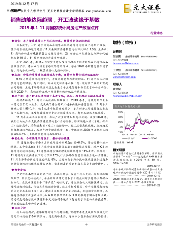 【光大证券】【20191217】房地产行业2019年1~11月国家统计局房地产数据点评-12页 证券期货研究报告