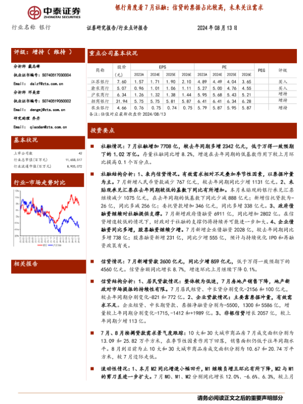 【中泰证券】【20240813】银行业银行角度看7月社融:信贷的票据占比较高,未来关注需求-14页 行业研究