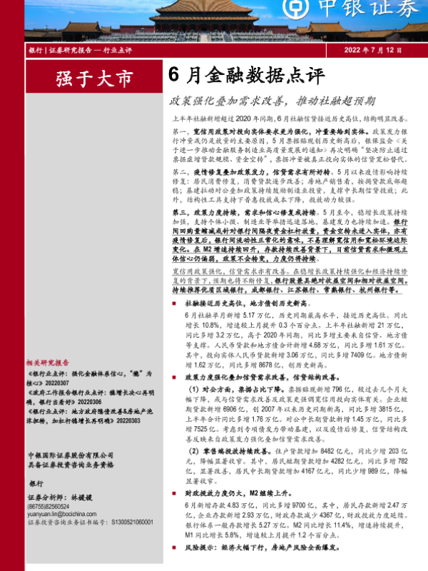 【中银证券】【20220712】6月金融数据点评:政策强化叠加需求改善,推动社融超预期-4页 行业研究
