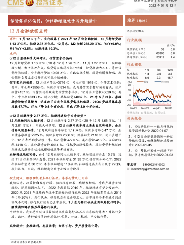 【海通证券】【20220112】12月金融数据点评:信贷需求仍偏弱,但社融增速处于回升趋势中-5页 证券期货研究报告