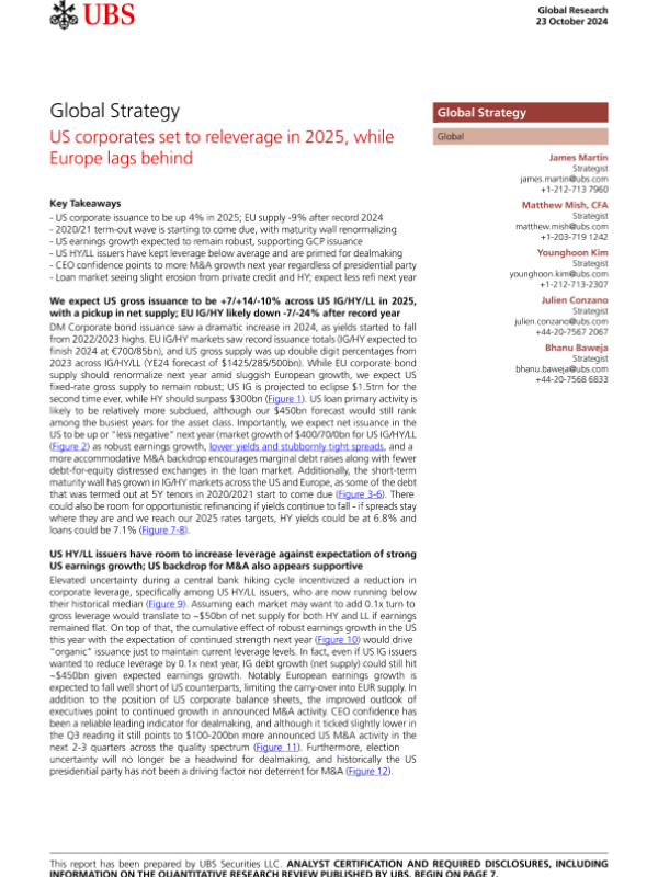 【UBS Securities LLC】【20241023】US corporates set to releverage in 2025, while Europe lags behind-10页 宏观策略