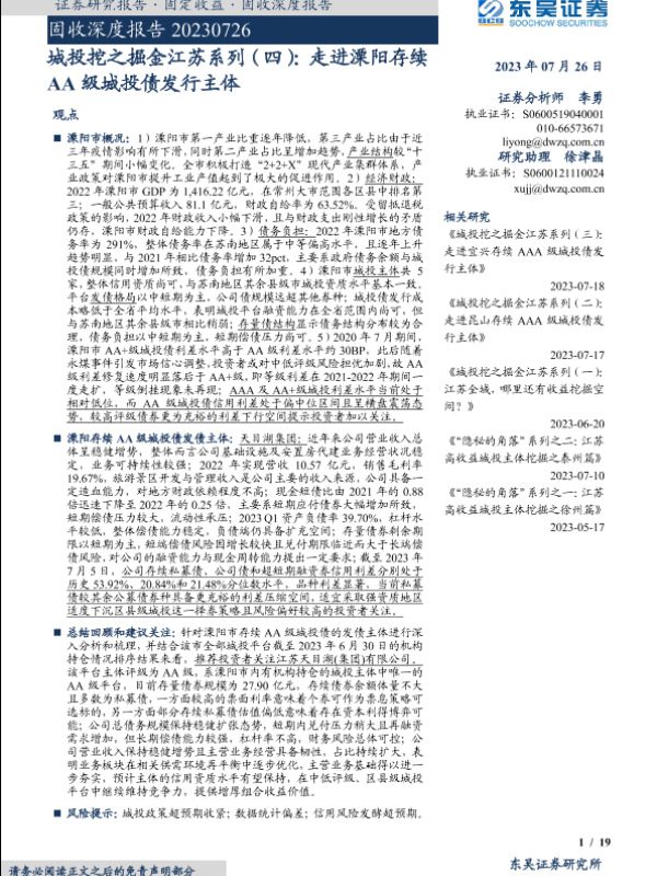 【东吴证券】【20230726】城投挖之掘金江苏系列(四):走进溧阳存续AA级城投债发行主体-19页 行业研究