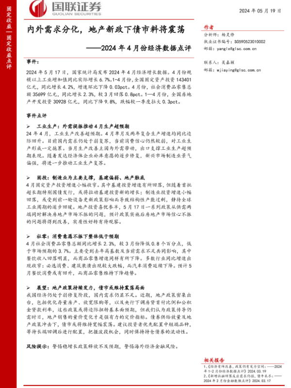 【国联证券】【20240519】2024年4月份经济数据点评:内外需求分化,地产新政下债市料将震荡-10页 行业研究
