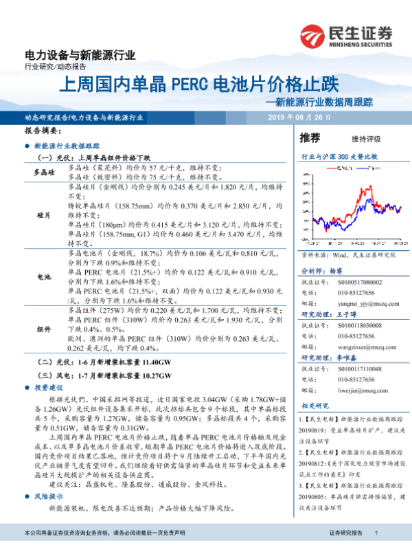 【民生证券】【20190826】20190826-民生证券-新能源行业数据周跟踪:上周国内单晶PERC电池片价格止跌-9页 行业研究