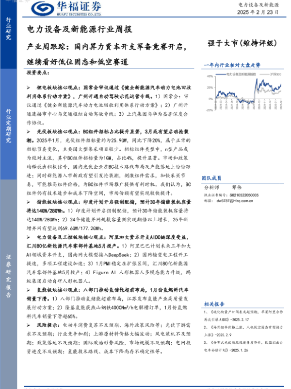 【华福证券】【20250223】电力设备及新能源行业周报:产业周跟踪,国内算力资本开支军备竞赛开启,继续看好低位固态和低空赛道-14页 行业研究