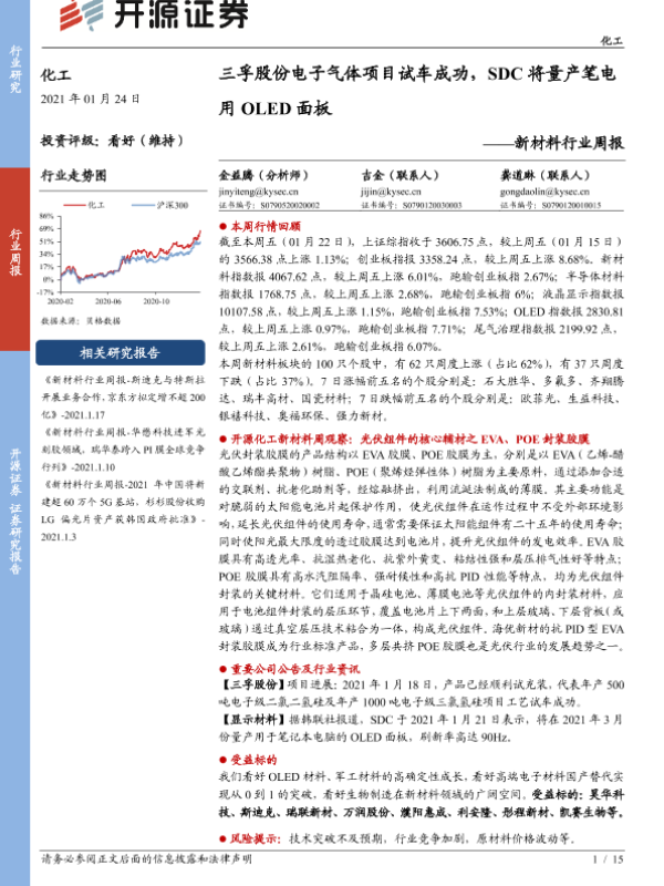 【开源证券】【20210124】新材料行业周报:三孚股份电子气体项目试车成功,SDC将量产笔电用OLED面板-15页 行业研究