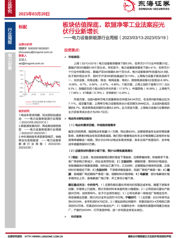 【东海证券】【20230320】20230320-东海证券-电力设备新能源行业周报:板块估值探底,欧盟净零工业法案迎光伏行业新增长-35页 行业研究