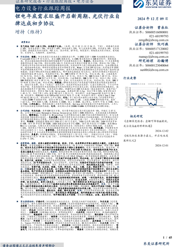 【东吴证券】【20241209】电力设备行业跟踪周报:锂电年底需求旺盛开启新周期、光伏行业自律达成初步协议-45页 行业研究