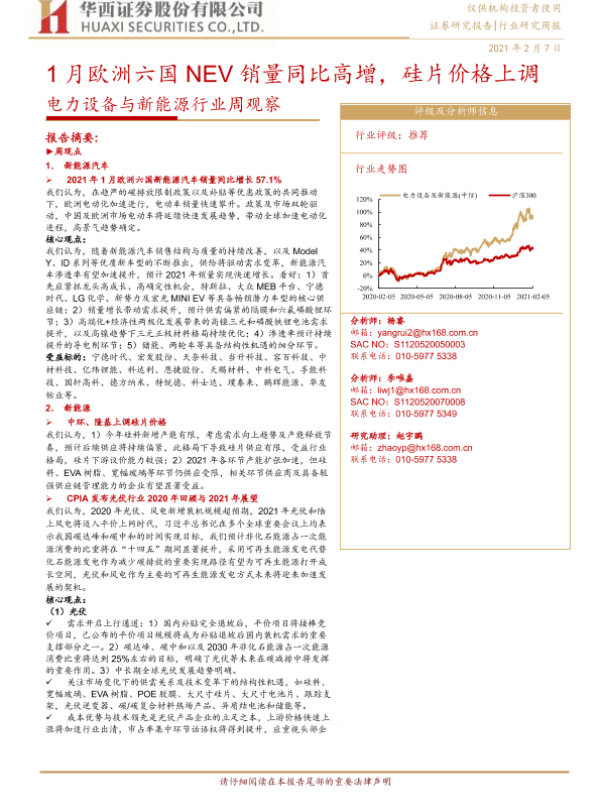 【华西证券】【20210207】电力设备与新能源行业周观察:1月欧洲六国NEV销量同比高增,硅片价格上调-18页 行业研究