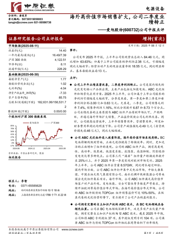 【中原证券】【20250812】爱旭股份公司中报点评:海外高价值市场销售扩大,公司二季度业绩转正-5页 证券期货研究报告