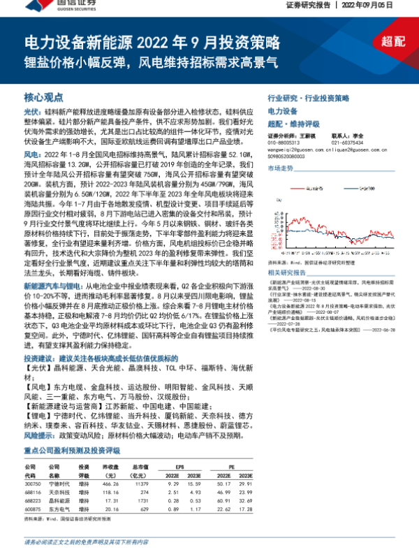 【国信证券】【20220905】电力设备新能源2022年9月投资策略:锂盐价格小幅反弹,风电维持招标需求高景气-21页 行业研究