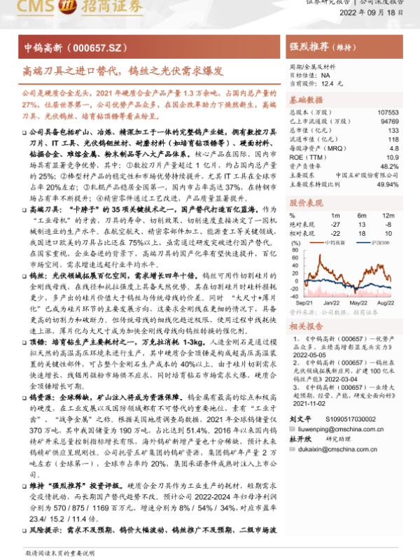 【海通证券】【20220918】中钨高新-000657.SZ-高端刀具之进口替代,钨丝之光伏需求爆发-26页 证券期货研究报告