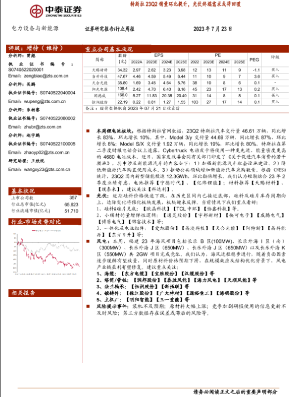 【中泰证券】【20230723】电力设备与新能源行业周报:特斯拉23Q2销量环比提升,光伏终端需求或将回暖-24页 行业研究