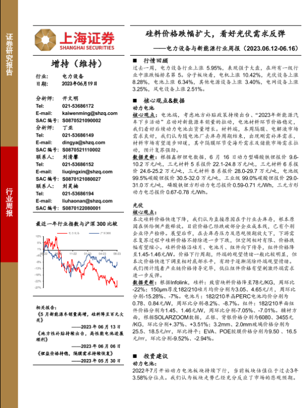 【上海证券】【20230619】电力设备与新能源行业周报:硅料价格跌幅扩大,看好光伏需求反弹-26页 行业研究