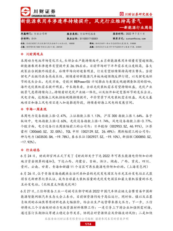 【川财证券】【20220701】20220701-川财证券-新能源行业周报:新能源乘用车渗透率持续提升,风光行业维持高景气-14页 行业研究