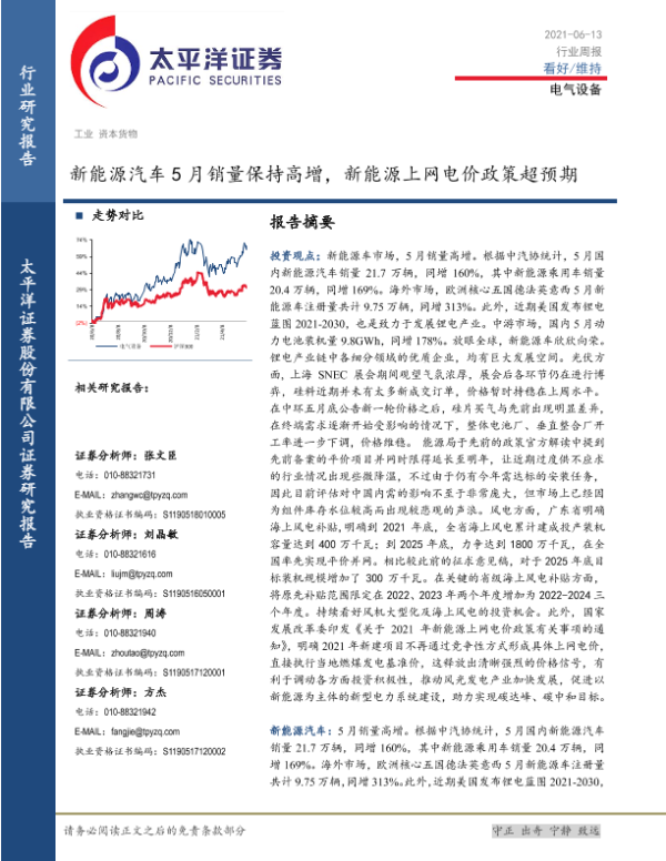 【太平洋证券】【20210613】电气设备行业周报:新能源汽车5月销量保持高增,新能源上网电价政策超预期-16页 行业研究