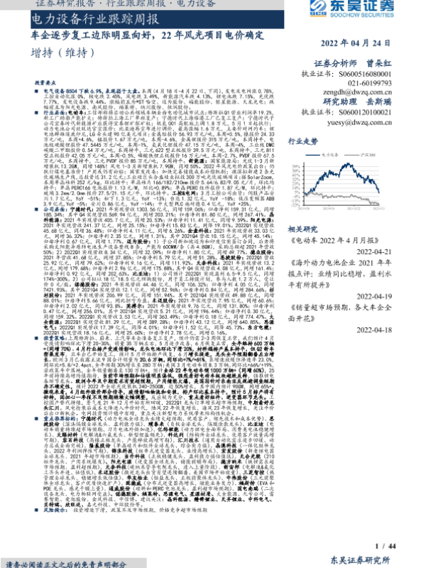 【东吴证券】【20220424】电力设备行业跟踪周报:车企逐步复工边际明显向好,22年风光项目电价确定-44页 行业研究
