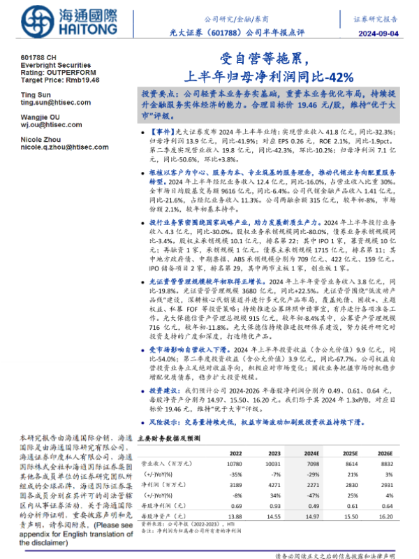 【海通国际】【20240904】光大证券(601788)受自营等拖累,上半年归母净利润同比-42%-14页 行业研究
