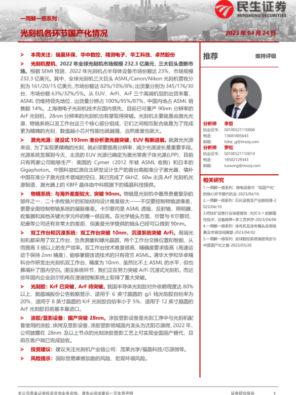 【民生证券】【20230424】机械一周解一惑系列:光刻机各环节国产化情况-19页 行业研究