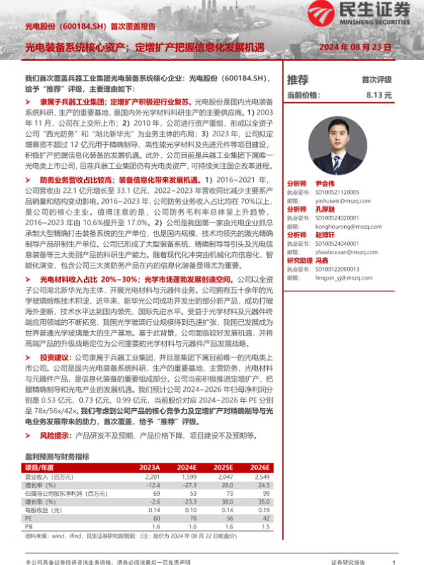 【民生证券】【20240823】光电股份(600184)首次覆盖报告:光电装备系统核心资产;定增扩产把握信息化发展机遇-25页 行业研究