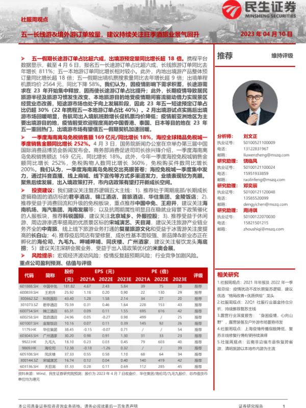 【民生证券】【20230410】社服周观点:五一长线游&境外游订单放量,建议持续关注旺季酒旅业景气回升-23页 行业研究