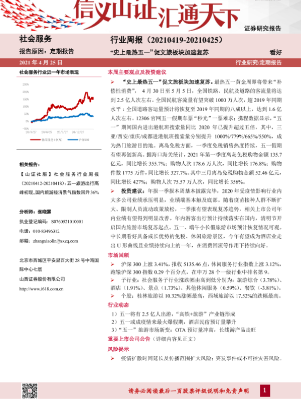 【山西证券】【20210425】社会服务行业周报:“史上最热五一”促文旅板块加速复苏-9页 行业研究