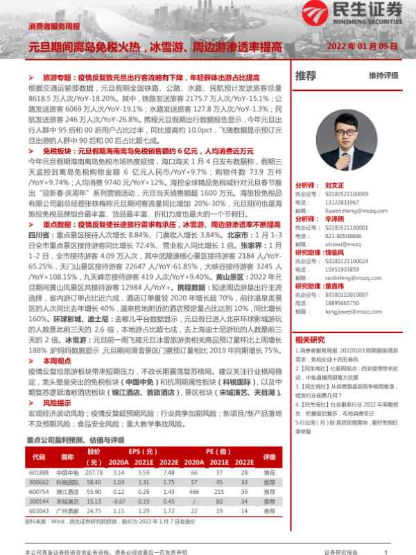 【民生证券】【20220109】消费者服务周报:元旦期间离岛免税火热,冰雪游、周边游渗透率提高-31页 行业研究