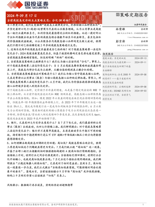 【国投证券】【20240917】当前高股息定价的五点策略反思:分化OR终结?-10页 行业研究