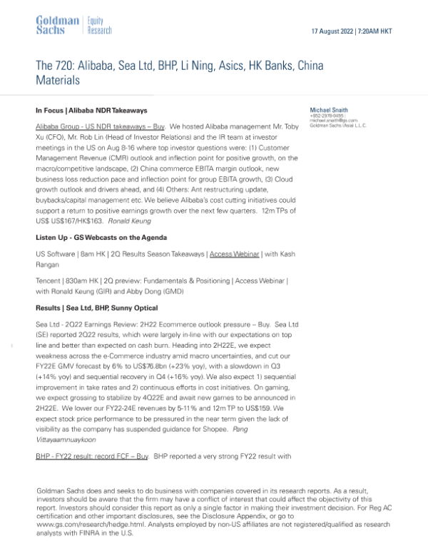 【Goldman Sachs】【20220817】The 720_ Alibaba, Sea Ltd, BHP, Li Ning, Asics, HK Banks, China Materials-8页 行业研究