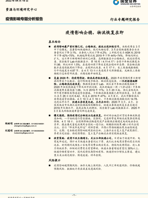 【国金证券】【20220418】交通运输行业疫情影响专题分析报告:疫情影响企稳,物流恢复在即-16页 行业研究