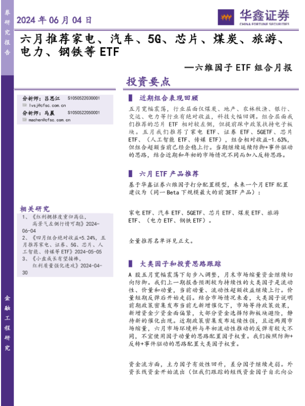 【华鑫证券】【20240604】六维因子ETF组合月报:六月推荐家电、汽车、5G、芯片、煤炭、旅游、电力、钢铁等ETF-17页 行业研究