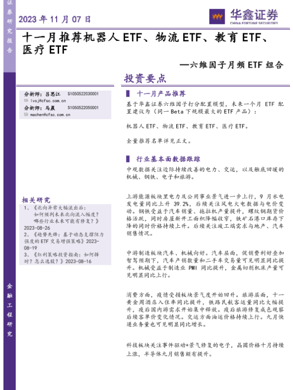 【华鑫证券】【20231107】六维因子月频ETF组合:十一月推荐机器人ETF、物流ETF、教育ETF、医疗ETF-17页 行业研究