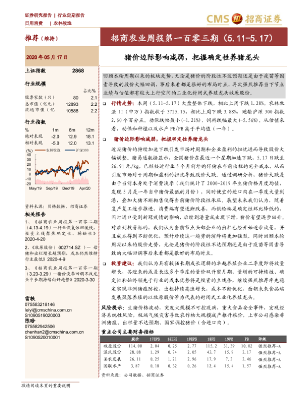 【海通证券】【20200517】招商农业周报第一百零三期:猪价边际影响减弱,把握确定性养猪龙头-26页 行业研究