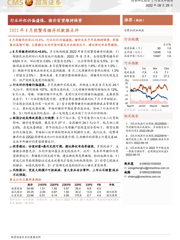 【海通证券】【20220928】2022年8月能繁母猪存栏数据点评:行业补栏仍偏谨慎,猪价有望维持强势-3页 行业研究
