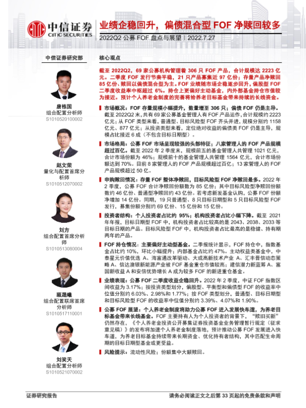 【中信证券】【20220727】2022Q2公募FOF盘点与展望:业绩企稳回升,偏债混合型FOF净赎回较多-34页 行业研究