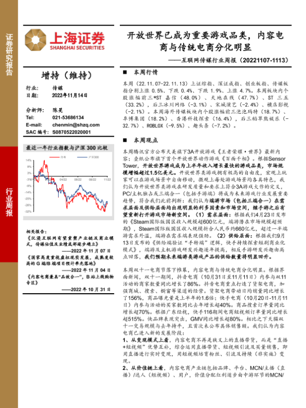 【上海证券】【20221114】互联网传媒行业周报:开放世界已成为重要游戏品类,内容电商与传统电商分化明显-24页 行业研究