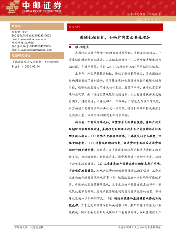 【中邮证券】【20240715】宏观研究:兼顾长短目标,加码扩内需必要性增加-18页 行业研究