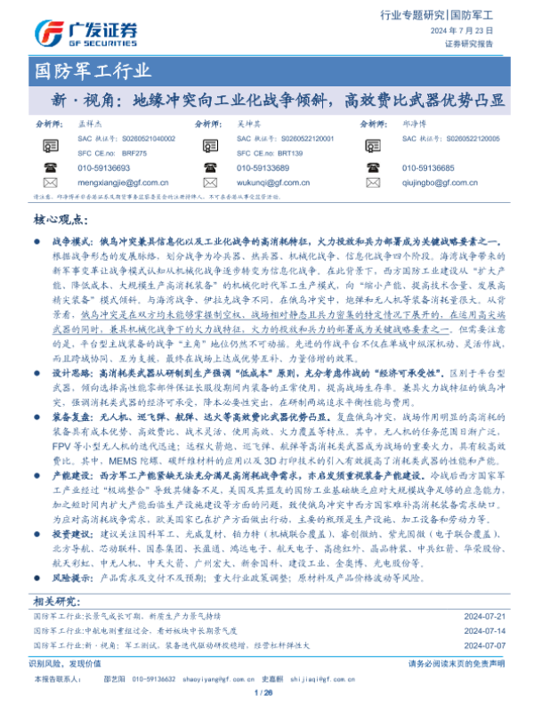 【广发证券】【20240723】国防军工行业新视角:地缘冲突向工业化战争倾斜,高效费比武器优势凸显-26页 行业研究