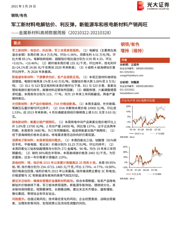【光大证券】【20210329】金属新材料高频数据周报:军工新材料电解钴价、利反弹,新能源车和核电新材料产销两旺-26页 行业研究
