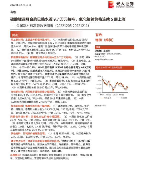 【光大证券】【20221210】20221210-光大证券-有色金属新材料高频数据周报:碳酸锂远月合约已贴水近9.7万元每吨,氧化镨钕价格连续5周上涨-26页 行业研究