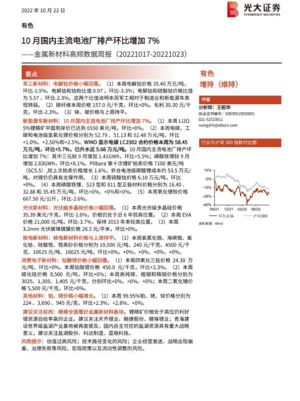 【光大证券】【20221022】有色金属行业金属新材料高频数据周报:10月国内主流电池厂排产环比增加7%-26页 行业研究
