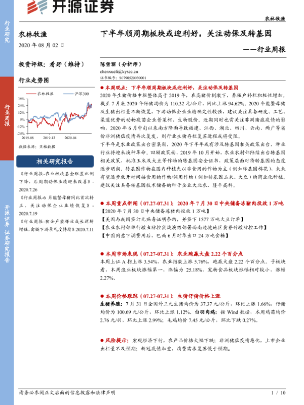【开源证券】【20200802】农林牧渔行业周报:下半年顺周期板块或迎利好,关注动保及转基因-10页 行业研究