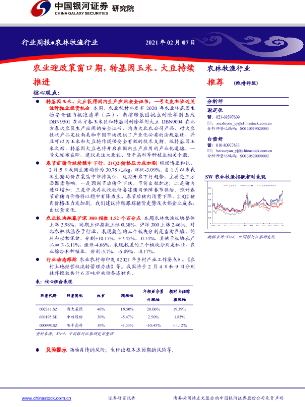 【银河证券】【20210207】中国银河-农林牧渔行业周报:农业迎政策窗口期,转基因玉米、大豆持续推进-18页 行业研究