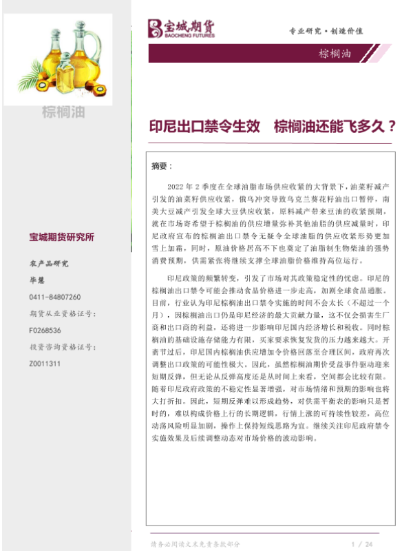 【宝城期货】【20220509】棕榈油:印尼出口禁令生效,棕榈油还能飞多久?-22页 行业研究