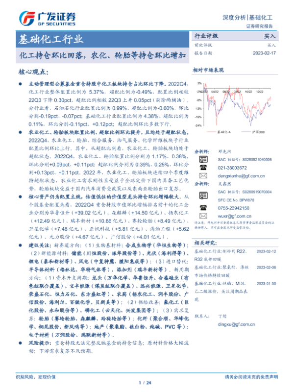 【广发证券】【20230217】基础化工行业深度分析:化工持仓环比回落,农化、轮胎等持仓环比增加-24页 行业研究