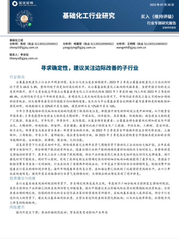 【国金证券】【20230726】基础化工行业专题研究报告:寻求确定性,建议关注边际改善的子行业-18页 行业研究
