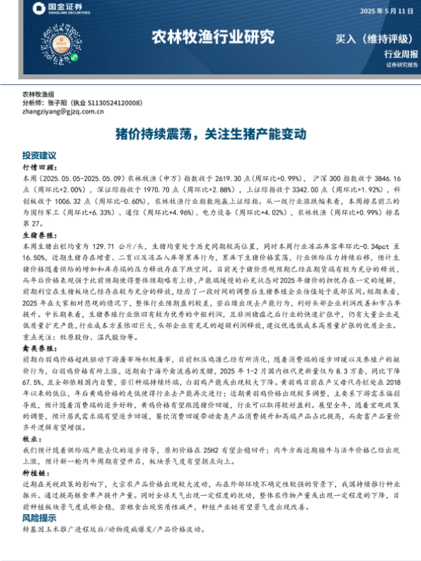 【国金证券】【20250511】农林牧渔行业研究:猪价持续震荡,关注生猪产能变动-13页 行业研究