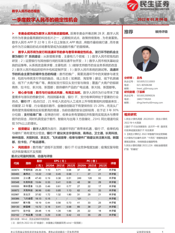 【民生证券】【20220108】计算机:数字人民币动态报告:一季度数字人民币的确定性机会-13页 行业研究